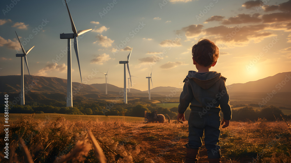 Fascinated Young Boy and the Giant Wind Turbine #658116440