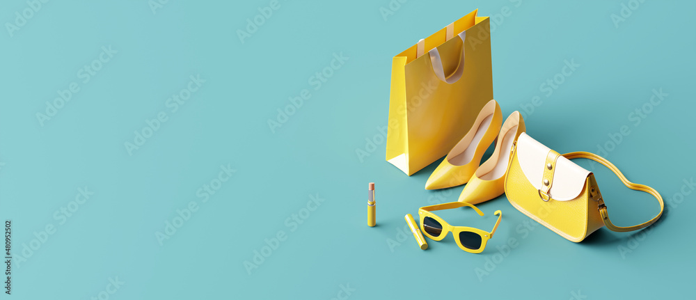 Fashion accessories bag, high heels, lipstick, sun glasses, shopping bag on pastel blue background. 3d rendering #480952502