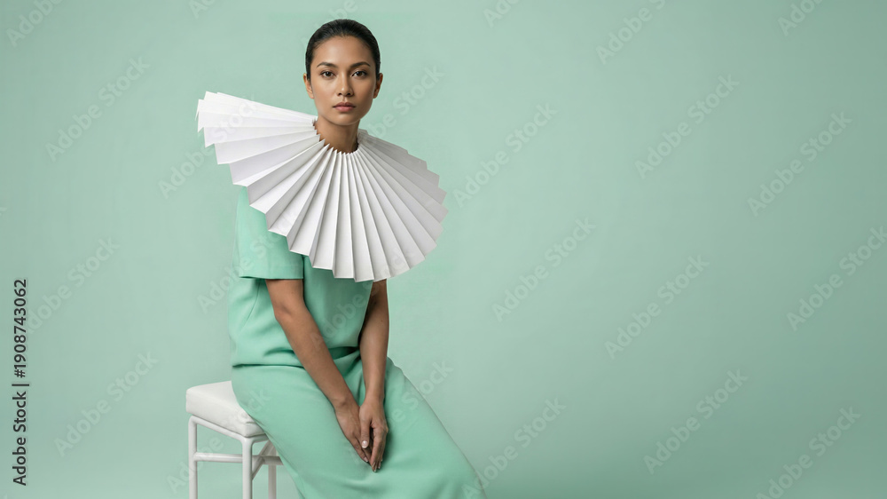 Fashion portrait of woman wearing large white pleated paper ruff collar, mint green dress, monochromatic pastel background, minimalist studio concept. #1908743062