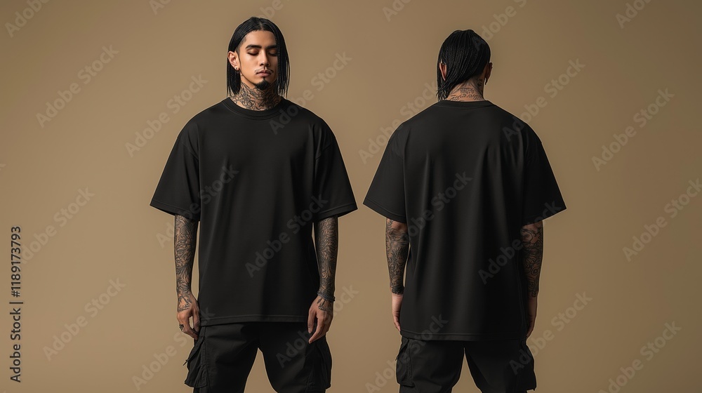 Fashionable oversized black t-shirt mockup displayed from front and back for apparel branding and design #1189173793