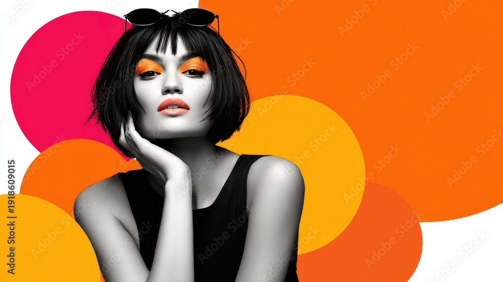 Fashionable Woman with Vibrant Makeup and Retro Sunglasses Against Colorful Abstract Background #1918609015