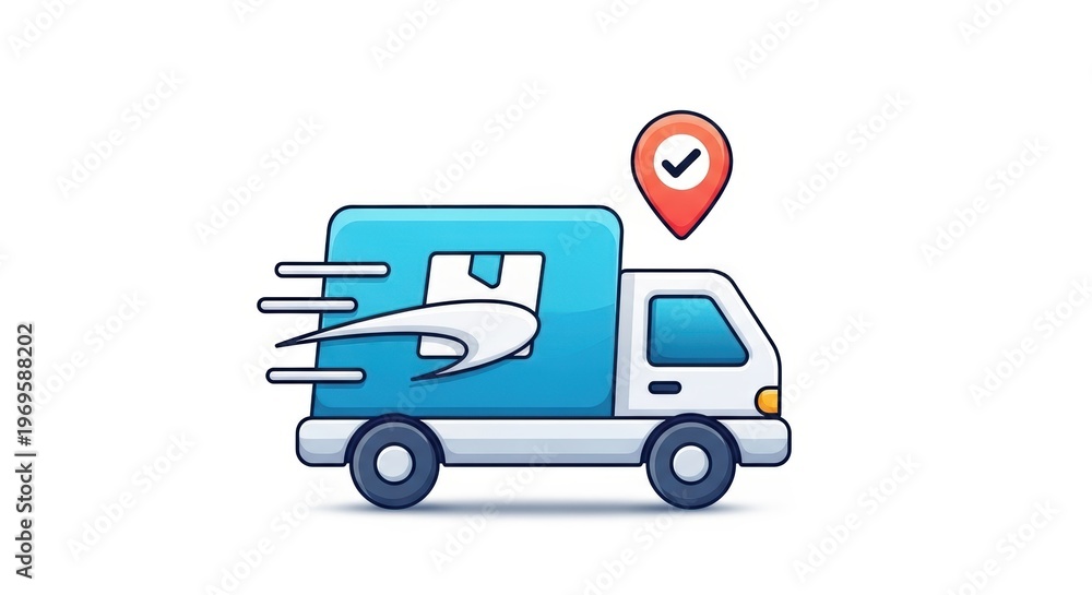 Fast delivery truck icon with speed lines, blue shipping van with package symbol, logistics transport vehicle with location pin and checkmark #1969588202
