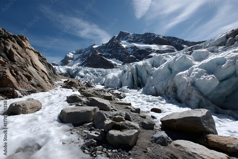 Faszinierende Eislandschaft mit massiven Gletscherblöcken und schroffen Felsen im Hochgebirge #1770568358