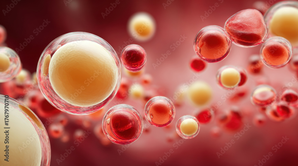 Fat droplet close up in red plasma with floating cells, detailed microscopic view showing biological structure and texture vividly #1767970710
