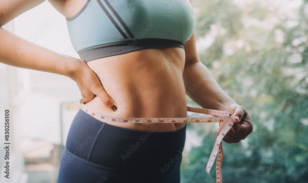 fat woman, fat belly, chubby, obese woman hand holding excessive belly fat with measure tape, woman diet lifestyle concept #830256100