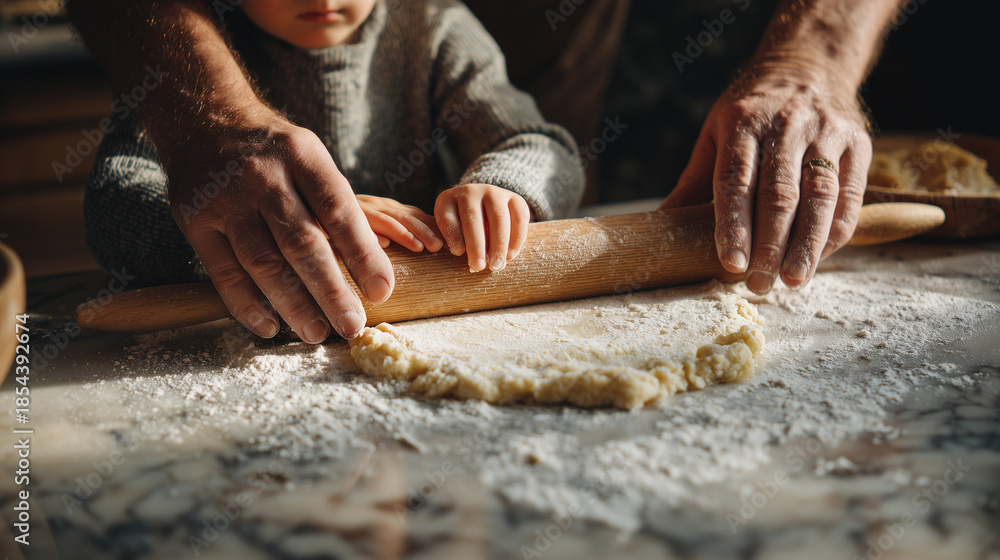 Father and young son baking cake together in a bright home kitchen, joyful family bonding moment, teaching child cooking skills and creating sweet homemade memories. #1854392674