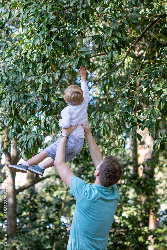 Father holding his young son up to reach a branch on a tall tree #1881287324