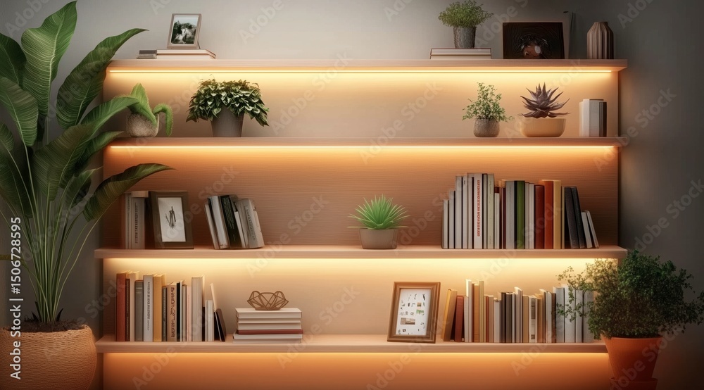 Featuring Warm Accent Lighting on Built-in Bookshelves Adorned, Plants, Decor Items, Cozy Elegant Home Library: Zoom Virtual Meetings Backgrounds, Stylish Interior Backdrops Design, Empty Living Room #1506728595