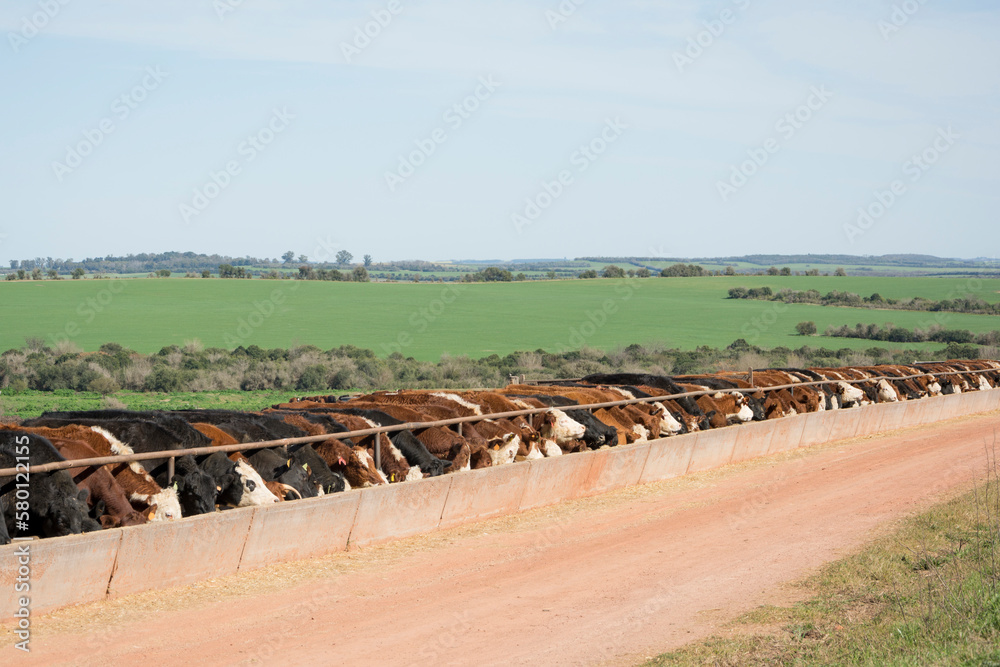 feedlot with Hereford and Angus cattle eating alfalfa #580122155