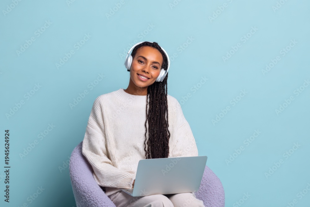 Female african adult smiling with headphones and laptop seated in a purple chair against a light blue background for remote work and study #1945624924