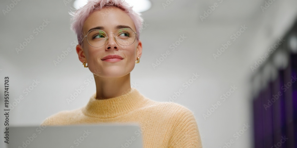 Female caucasian young professional with short pink hair wearing glasses in data center using laptop confident it engineer network specialist #1955741703