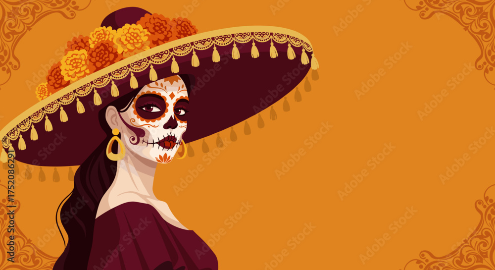Female character with traditional skull makeup wearing sombrero #1752086291