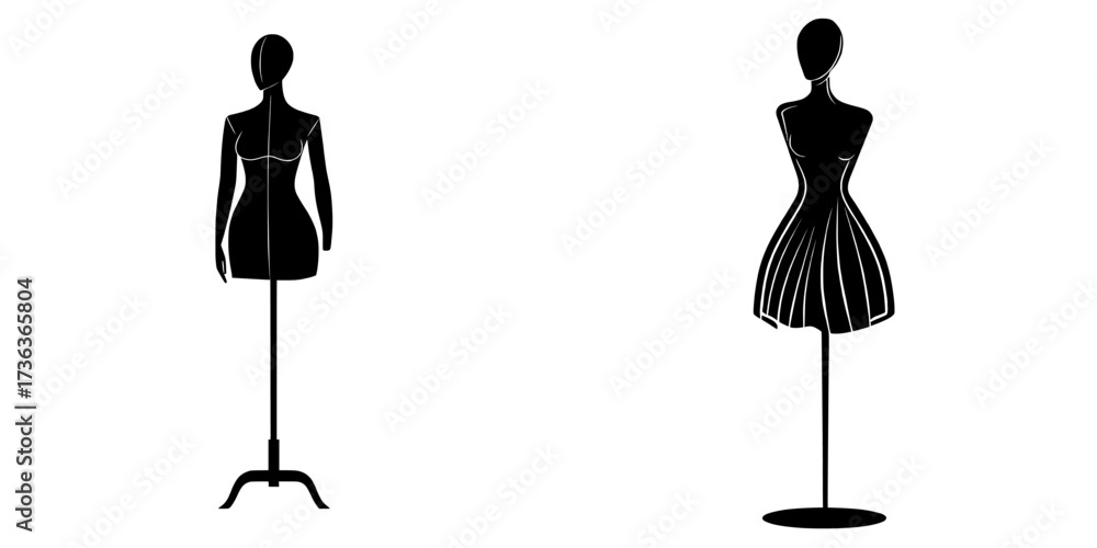 Female croqui line drawings are utilized for flat fashion sketches and computer-aided designs, featuring a modern mannequin design #1736365804