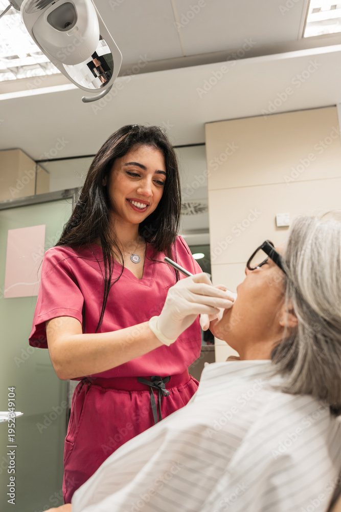 Female dentist wearing pink scrubs and gloves performing an oral examination on a patient in a modern dental clinic #1952349104