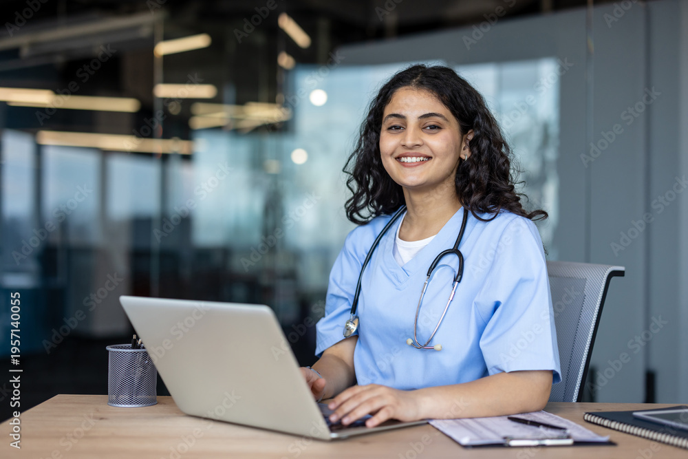 Female doctor working on laptop smiling at clinic #1957140055