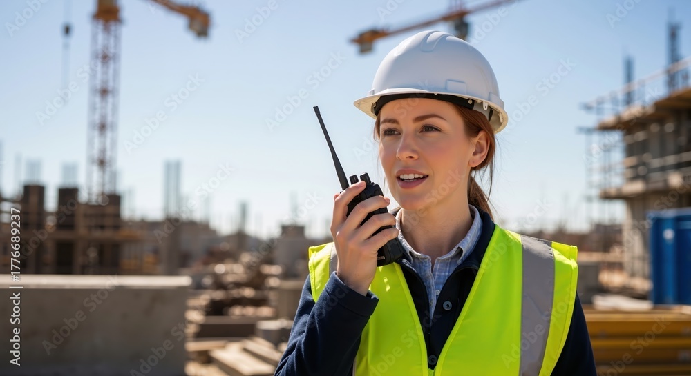 Female engineer using a walkie-talkie at a construction site. Professional woman in a hard hat and safety vest managing a building project #1776689237
