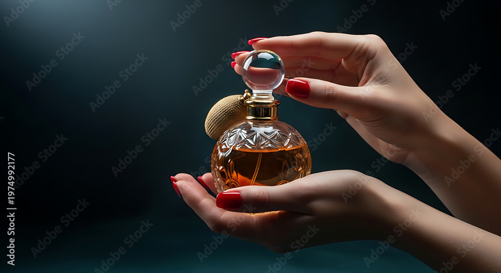 Female Hand Holding Vintage Perfume Bottle with Red Nails #1974992177