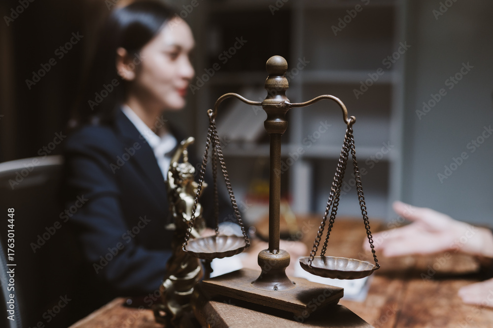 Female lawyer consulting client at desk with scales of justice, discussing legal documents, rights, and case strategy in office #1763014448