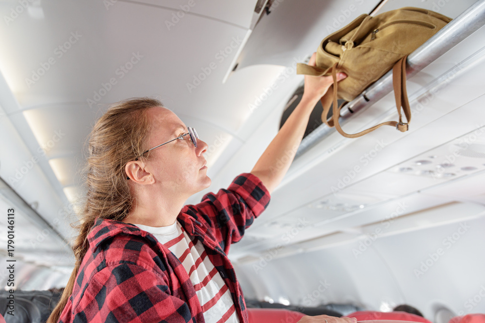 Female passenger is putting her hand luggage in overhead locker #1790146113