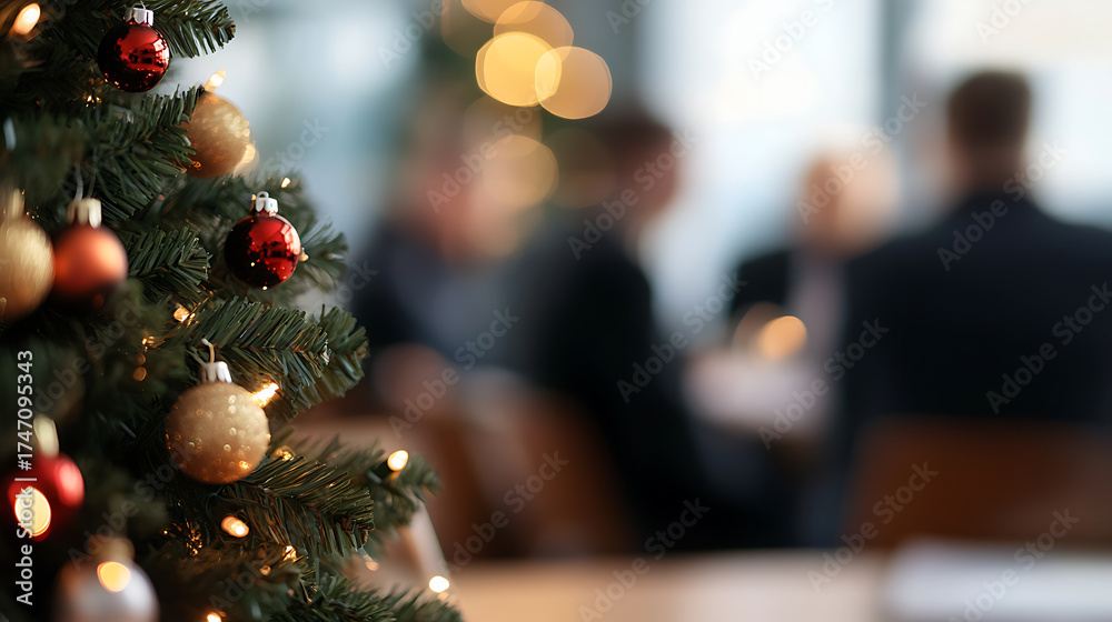 Festive business meeting with decorated tree. A holiday season gathering of colleagues in a professional setting, celebrating the year-end. #1747095343