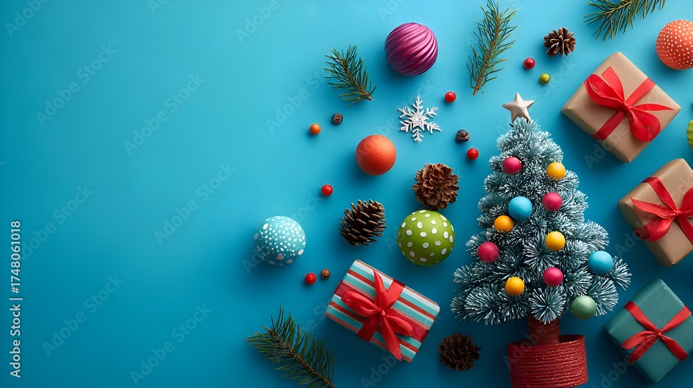 Festive Christmas decorations are arranged on a blue surface creating a joyful holiday season atmosphere. #1748061018