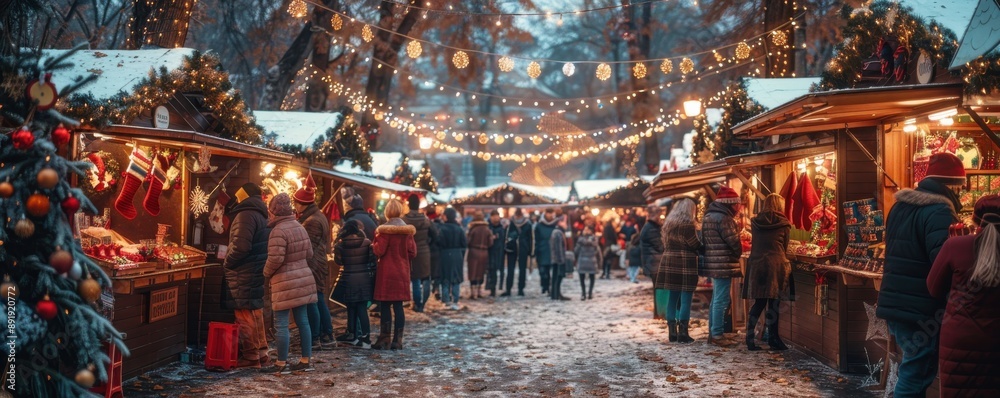 Festive Christmas market bustling with people, colorful stalls selling holiday goods, twinkling lights and decorations, joyful atmosphere, cold winter evening, copy space #891920772