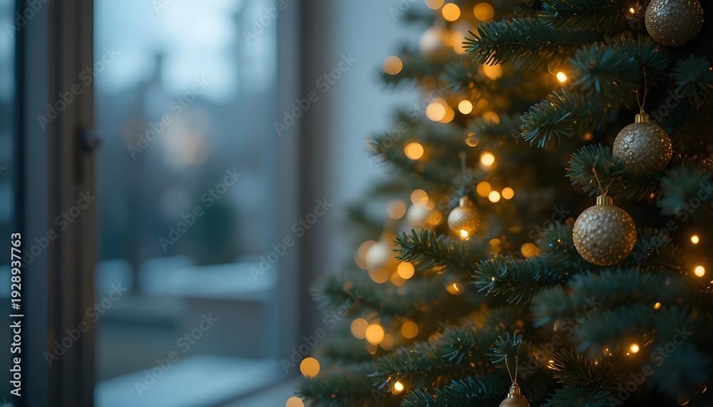 Festive Christmas Tree Background with Elegant Gold Blurred Lights and Warm Holiday Glow #1928937763