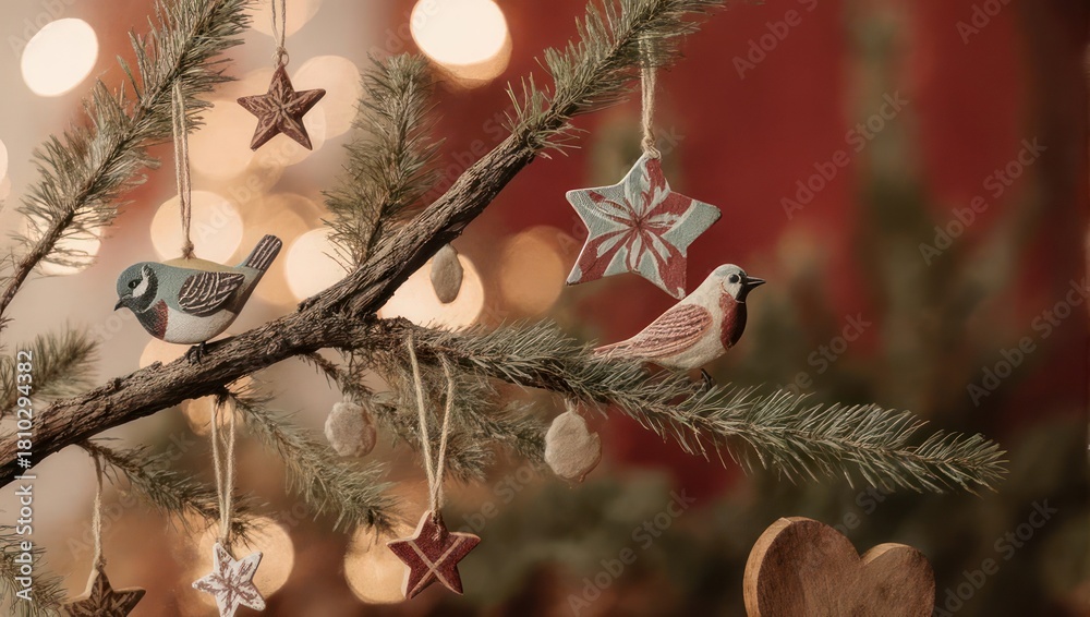Festive Christmas Tree Decorations with Bird Ornaments and Warm Bokeh Lights. #1810294382