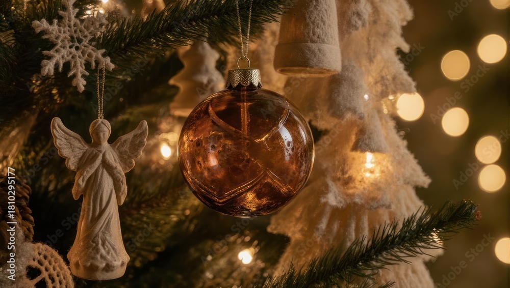 Festive Christmas tree decorations with warm lights and ornaments. #1810295177