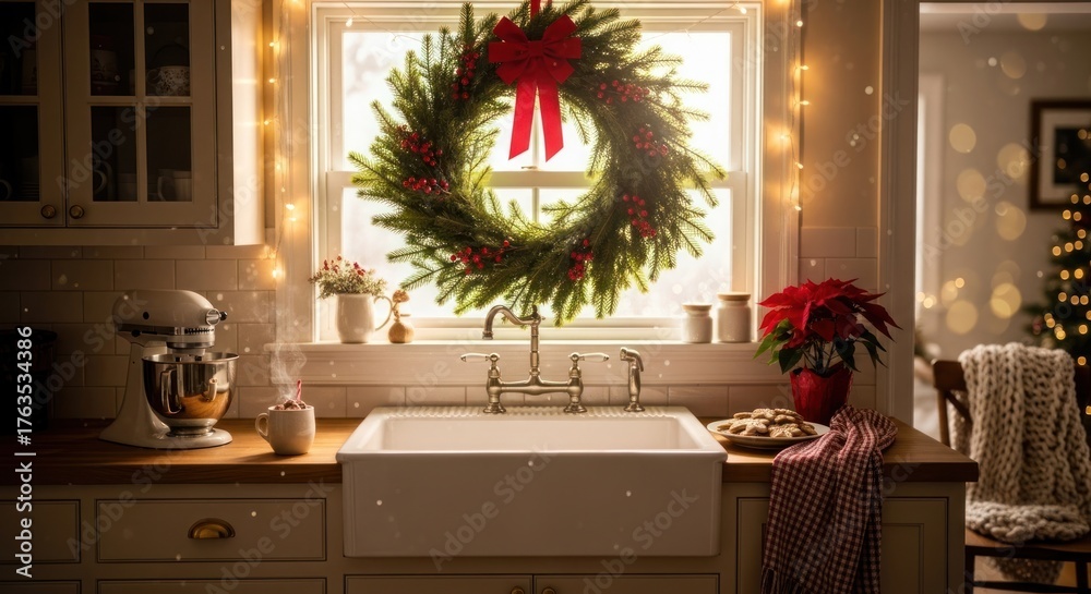 Festive christmas wreath hanging above kitchen sink with holiday decorations around #1763534386