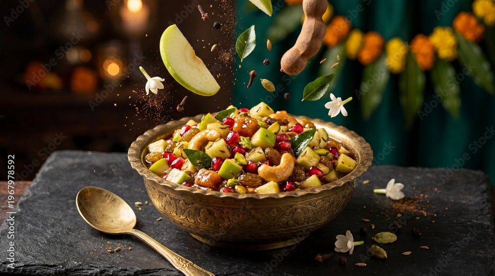 Festive Culinary Creation: A vibrant, artfully arranged dish of mixed fruits, nuts, and spices is set against a backdrop of warm candlelight and rich, earthy tones. #1967978592