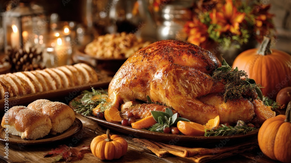 Festive Feast: A bountiful thanksgiving spread with a golden-roasted turkey, surrounded by classic side dishes, pumpkins, candles, and autumn foliage, invoking warmth and togetherness. Generative Ai #1680230103
