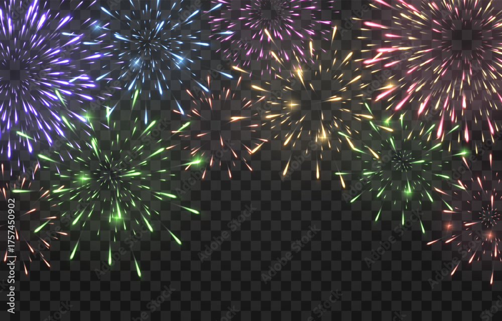 Festive fireworks with brightly shining sparks. New Year's Eve fireworks. Realistic sparks and explosions. Colorful pyrotechnics show. Vector isolated on png background. #1757450902