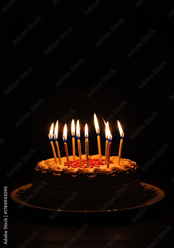 Festive glowing birthday cake topped with many burning flames creating a cozy, warm ambiance for celebration in the darkness ,traditional ,blurred ,birthday #1784943090
