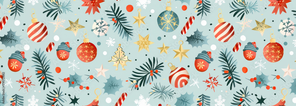 Festive Holiday Pattern: A seamless design filled with Christmas ornaments, pine branches, and other festive elements, creates a visually appealing and cheerful atmosphere. #1795721682