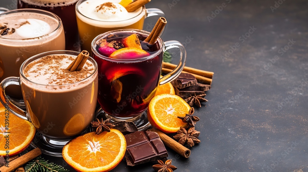 Festive hot drinks variety selection of winter beverages including hot chocolate mulled wine and spiced tea decorated with cinnamon sticks and orange slices #1396233868