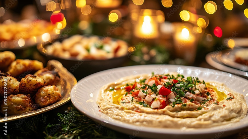 Festive Hummus Appetizer With Toppings Garnished #1907122868