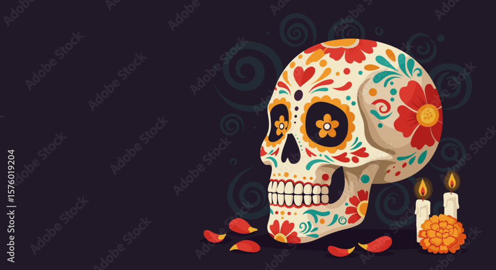 Festive illustration of a decorative Day of the Dead skull for cultural celebrations and event marketing #1576019204