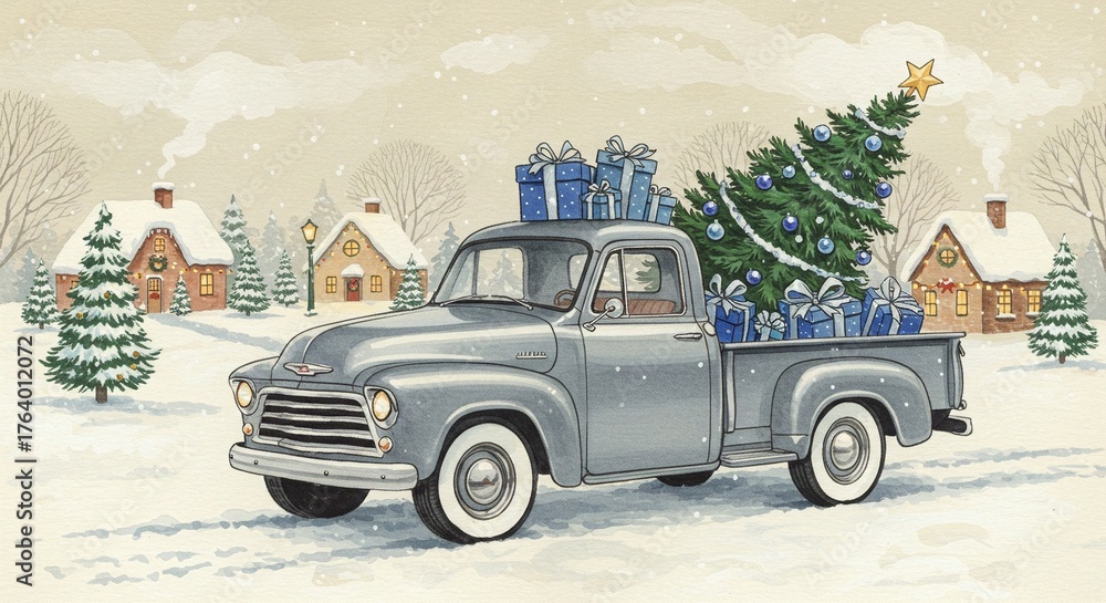 Festive pickup truck carries Christmas tree and blue wrapped gifts through a snowy winter landscape. Holiday cheer abounds! #1764012072