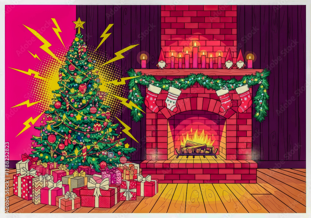 Festive pop art christmas tree and fireplace illustration. Holiday scene with bright boom effect. Winter celebration for greeting card. #1788252823