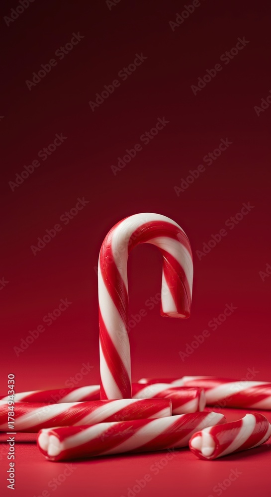 Festive red and white striped hook-shaped hard candies, commonly associated with winter celebrations, captured in a vibrant close-up on a clean background ,detail ,dessert food ,celebration #1784943430
