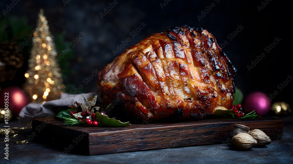 Festive roasted ham shines with caramelized glaze a holiday centerpiece on rustic wood platter #1786305522