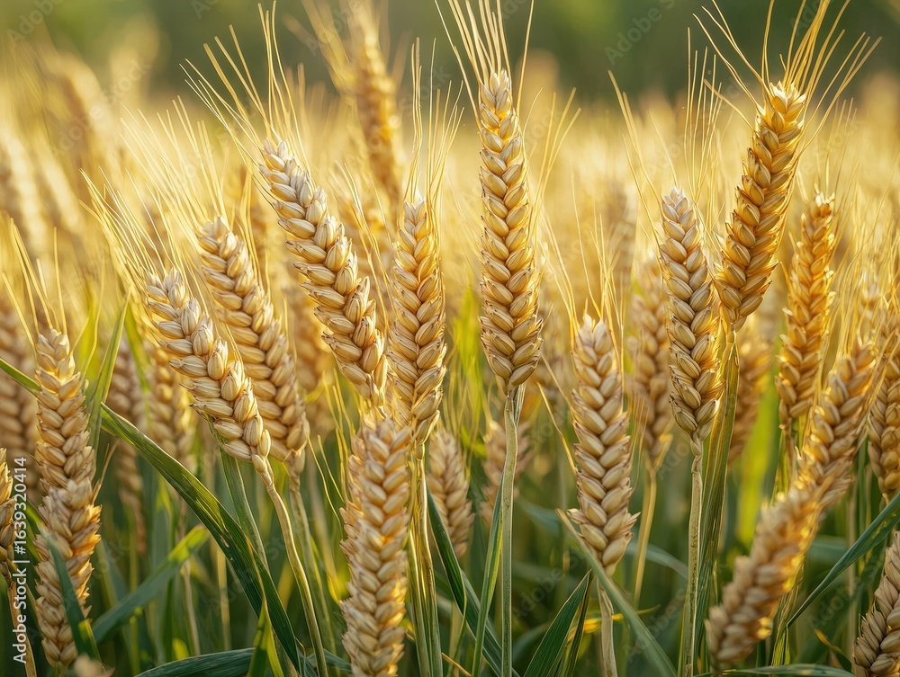 Field of wheat in sunny day, close up of ripening wheat ears, crops field, rural landscape #1639320414