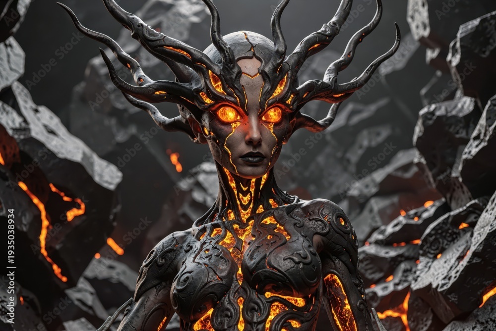 Fiery Demon Goddess With Glowing Eyes And Molten Orange Veins Amidst Volcanic Rock Formation #1935038934