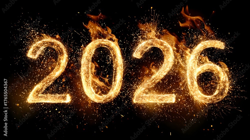 Fiery glowing digits of the year 2026 exploding with sparks and flames on a dark background #1765504367