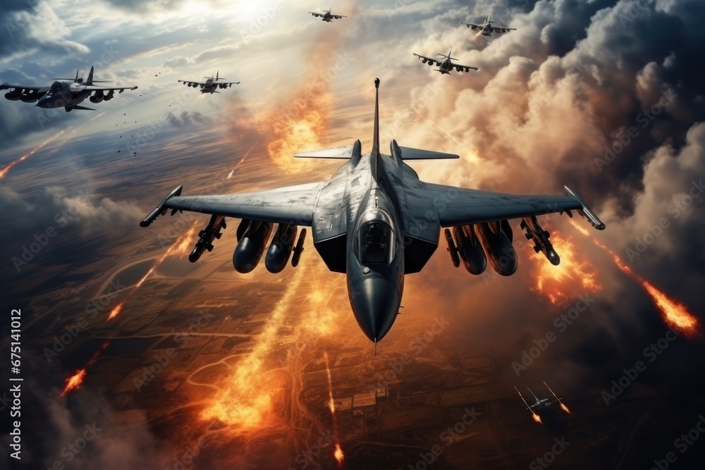 Fighter jets flying in a military combat zone. War zone in the sky. Generative AI #675141012