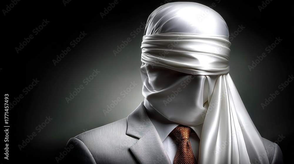 figure stands in a dark environment, covered with a white fabric around its head. suit and tie indicate a formal appearance, enhancing the air of mystery #1771457493