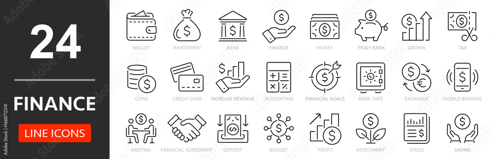Finance thin line icon set. Saving, increasing and spending finances. Payments elements, budget, loan, bank, deposit, money, profit, piggy bank - stock vector. #1668712541