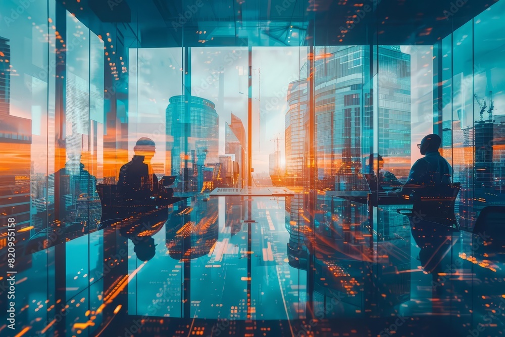 financial advisor consulting clients, wealth management, focus on, advisory theme, vibrant, double exposure, modern office backdrop #820955158
