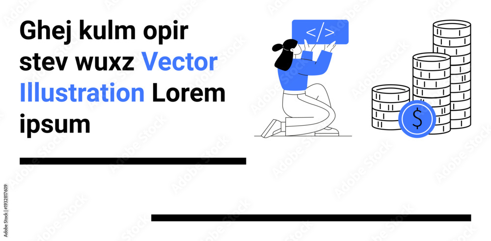 Financial technology, software development, investment growth, coding education, economic management, digital solutions. A woman holding a code block near stacked coins. Financial technology #1932817609